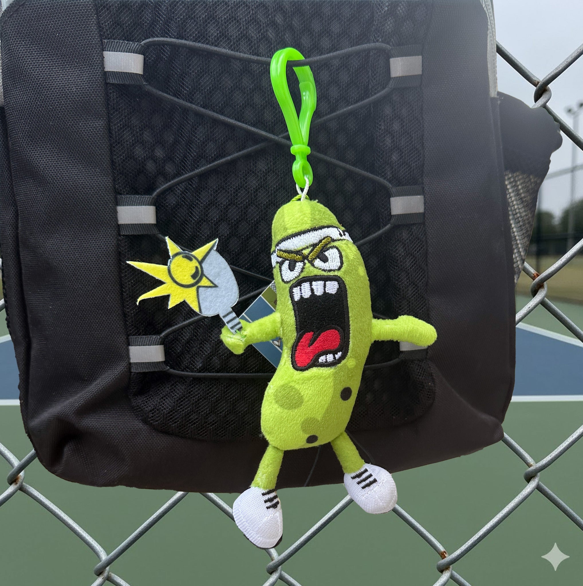 Meet your new favorite Pickleball court-side companion - the Pickle Monsters Plush Pickleball Keychain! This Pickle Monsters plush keychain features the legendary Daddy of all Pickle Monsters, Mr. Dill mid–pickleball action, complete with paddle, personality, and plenty of charm.