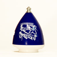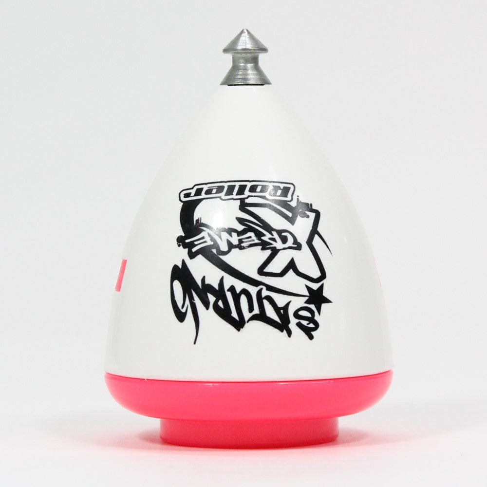 The Saturno Xtreme Roller is a medium sized, fast and steady spin top. It has a ball bearing, allowing the tip to rotate independently of the body. This feature enables a bunch of tricks not possible with a fixed axle spin top.